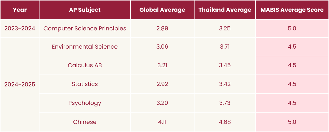This year, students from Grades 8-11 are enrolled in 5 AP courses: Calculus, Environmental Science, Statistics, Chinese and Psychology.